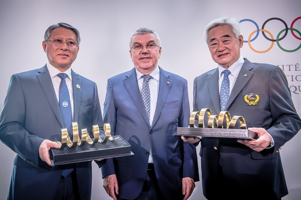 Il Presidente del CIO Thomas Bach premia il Presidente WT Chungwon Choue e quello della ITF Ri Yong So